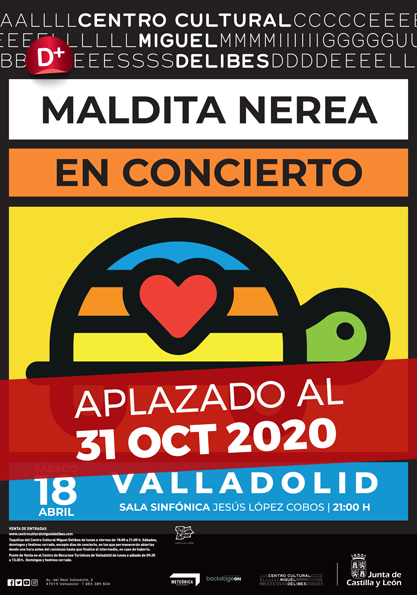 Estimado cliente, desde el Centro Cultural Miguel Delibes les informamos del cambio de fecha del concierto de Maldita Nerea al 31 de octubre en la misma sala a las 21:00h. Las entradas adquiridas para la fecha del día 18 de abril serán válidas para la nueva fecha. Las personas que deseen la devolución de sus entradas podrán hacerlo por las siguientes vías: – Si compraron las entradas vía internet (a través de www.centroculturalmigueldelibes.com) pueden solicitar la devolución del importe de su compra a esta dirección de correo: taquillas@ccmd.es. – Si adquirieron las entradas en Taquillas se procederá a su devolución en la misma entregando las entradas. Los horarios de Taquilla son los siguientes: